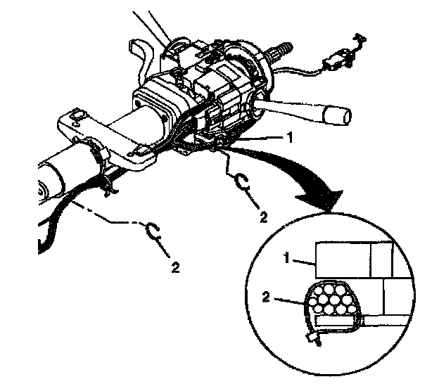 2. Remove the wire harness straps (2) from the steering column tilt head assembly (1) and the column.