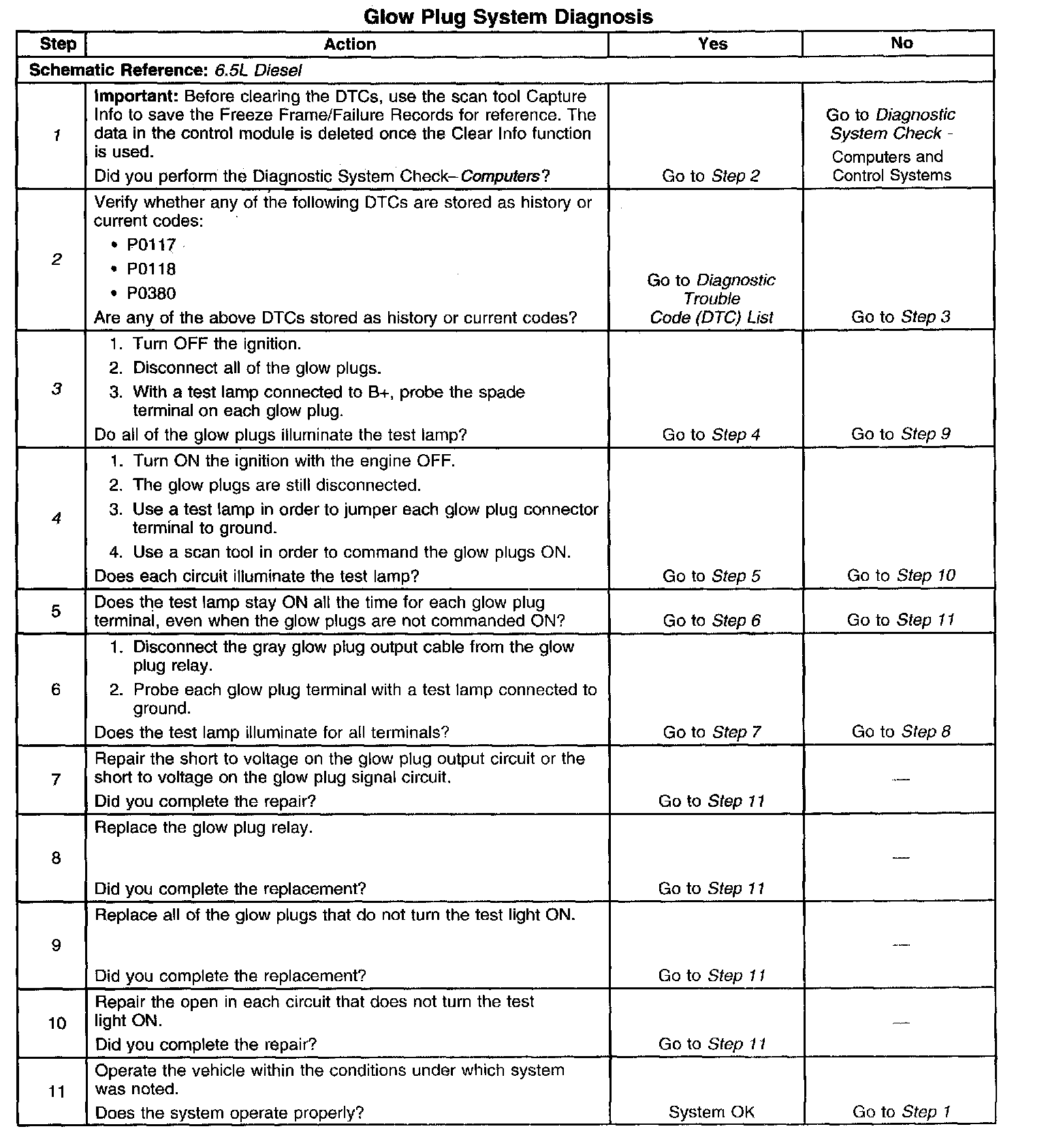 CIRCUIT DESCRIPTIONIMPORTANT: This check only applies to the Federal Glow Plug System. The Federal Glow Plug System does not have the ability to detect for a glow plug failure. The California Glow Plug System can determine glow plug failure by setting a DTC P0380. The glow plug system helps provide the heat required to begin combustion when starting the engine at cold ambient temperatures. The glow plugs are heated before and during cranking, as well as during the initial engine operation. The Powertrain Control Module (PCM) controls the amount of time the glow plugs are energized by monitoring coolant temperatures and the glow plug voltage. This system check will check the glow plugs and the glow plug feed circuit coming from the relay.