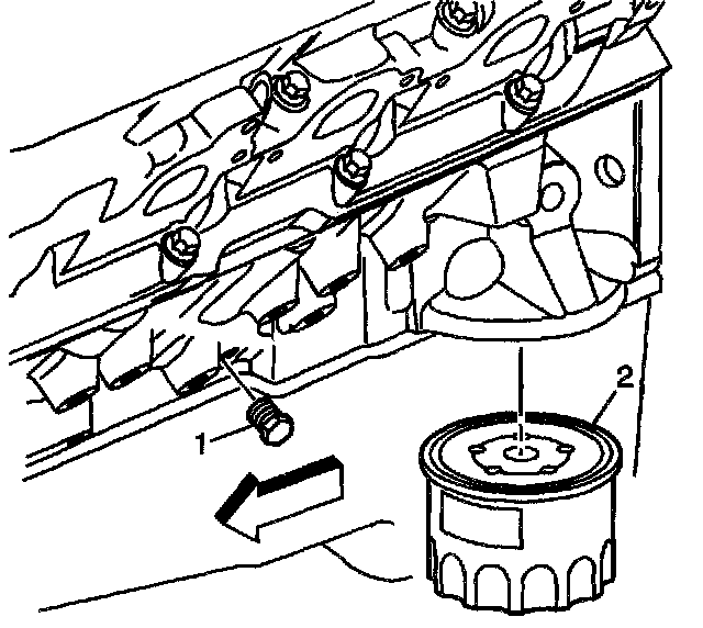 4. Remove the oil filter (2) from the engine block and allow the engine oil to drain completely.