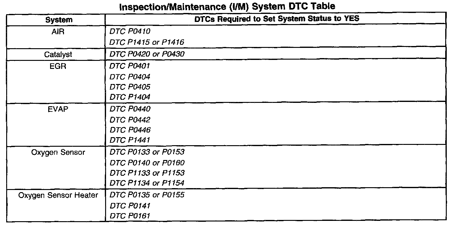 Inspection/Maintenance (I/M) System DTC Table: