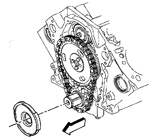 Important: Do not use a hammer to install the camshaft sprocket onto the camshaft. To do so may dislodge the expansion cup plug (camshaft rear bearing hole).