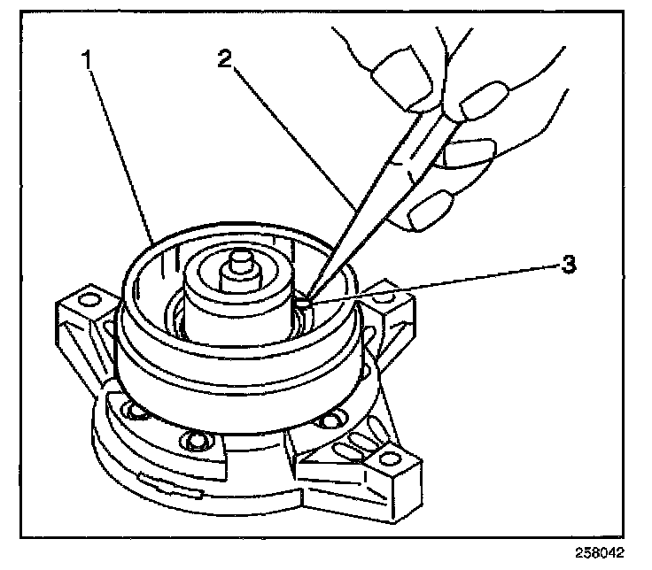 10. Use a 1/8 inch diameter drift punch (2) in order to stake the front head at 3 places 120 degrees apart (3), in order to ensure that the clutch coil (1) remains in position.