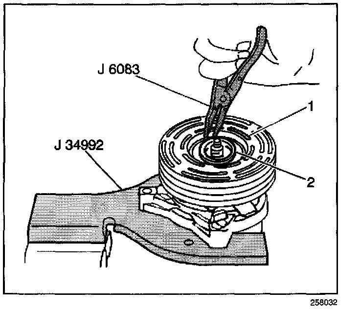 12. Tighten the J 8433-3 against the puller pilot in order to remove the clutch coil (2).
