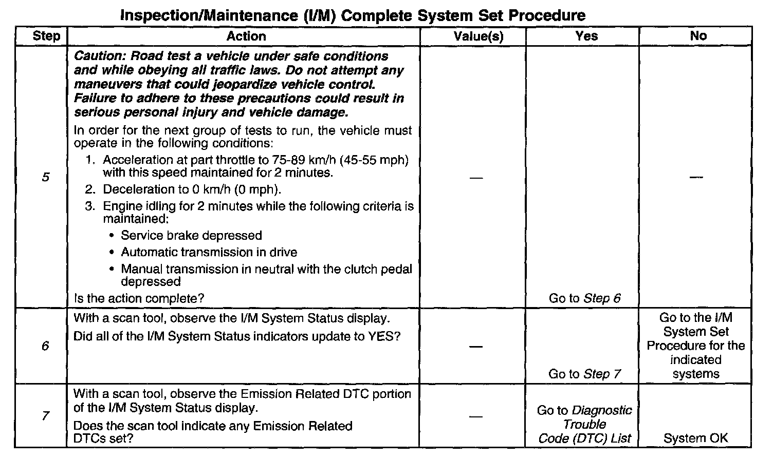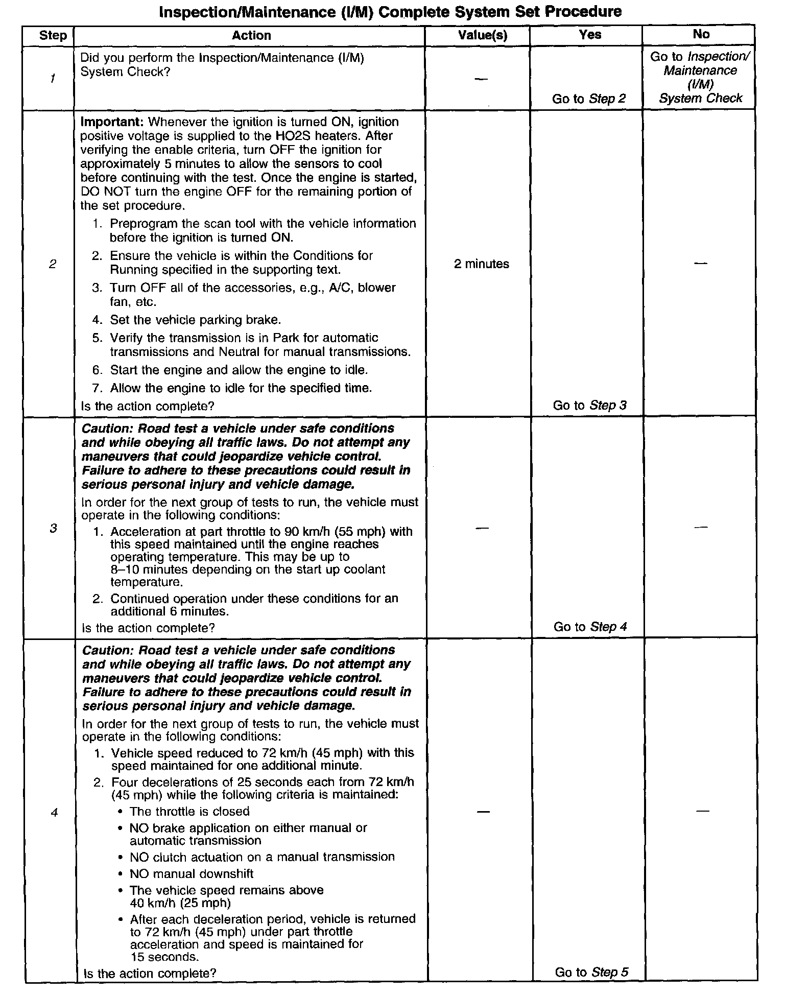 DESCRIPTIONThe purpose of the I/M Complete System Set Procedure is to satisfy the enable criteria necessary to execute all of the I/M readiness diagnostics, and complete the trips for those particular diagnostics. When all diagnostic tests are completed, the I/M System Status indicators are set to YES. Perform this test when more than one or all of the I/M System Status indicators are set to NO.