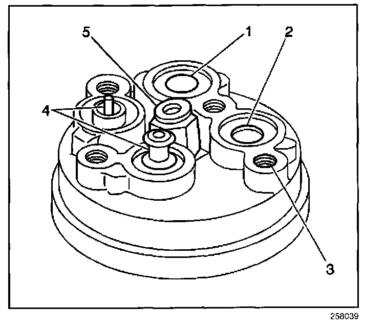 2. Connect the J 43600 low side and high side lines to the corresponding fittings on the J 39893. The suction port (1) (low-side) of the compressor has a large internal opening. The discharge port (high-side) has a smaller internal opening into the compressor. The discharge port (2) (high-side) also has a deeper recess.