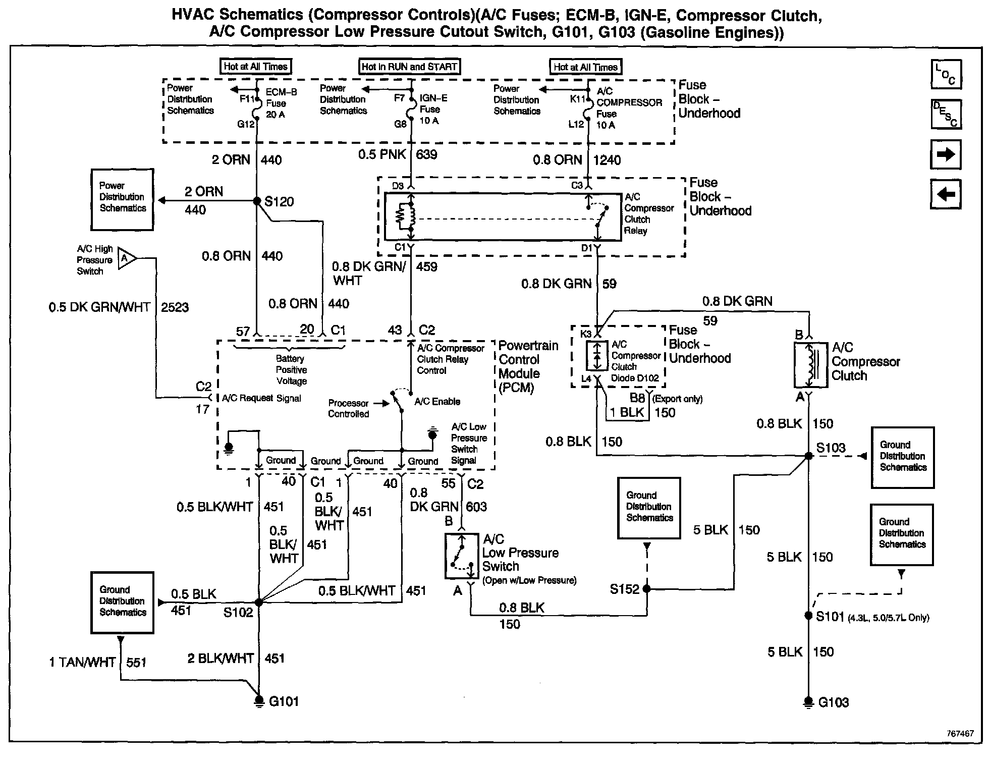 HVAC Schematics: Compressor Controls (A/C Fuses; ECM-B, IGN-E, Compressor Clutch, A/C Compressor Low Pressure Cutout Switch, G101, G103: