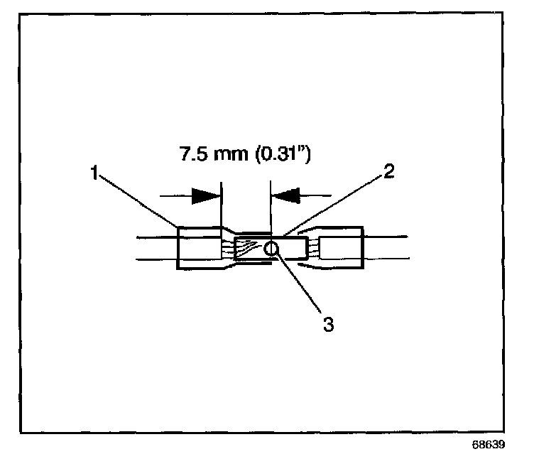 6. Place the splice sleeve in the nest. Ensure that the crimp falls midway between the end of the barrel and the stop. The sleeve has a stop (3) in the middle of the barrel (2) in order to prevent the wire (1) from going further. Close the hand crimper handles slightly in order to firmly hold the splice sleeve in the proper nest.