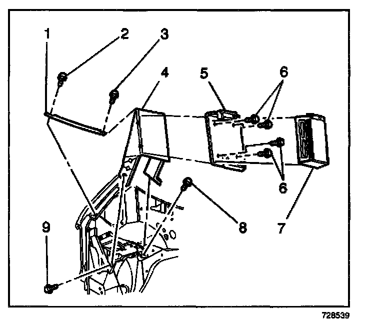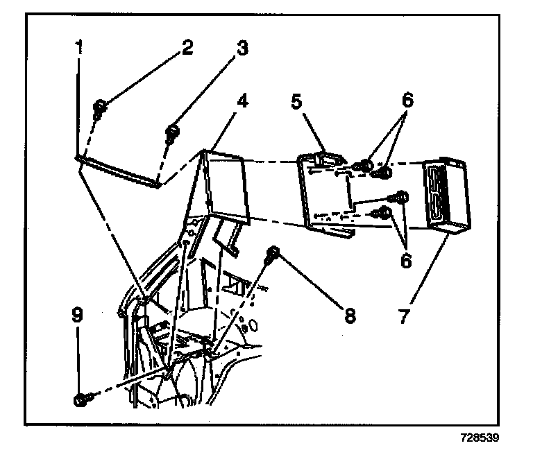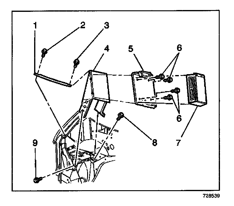 1. Install the ECM adapter bracket into the vehicle ensuring that the bracket is placed on the loosened forward bolt (9).