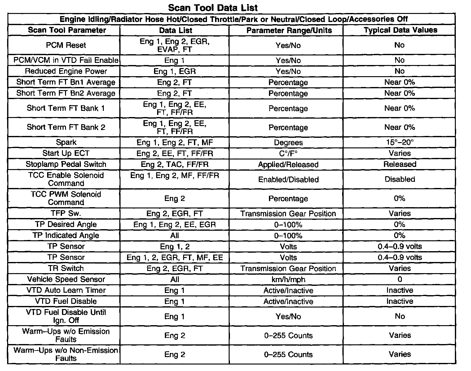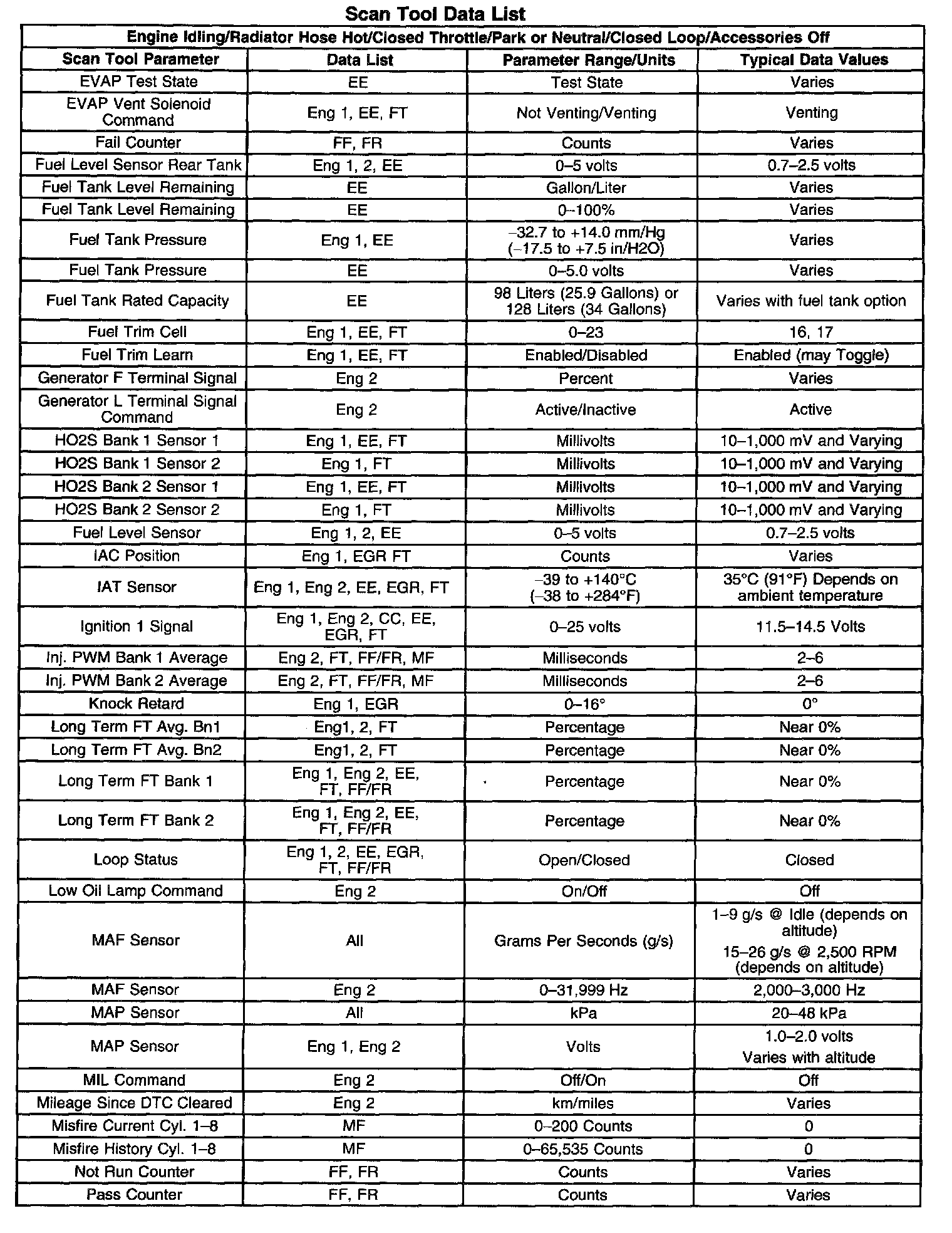 The Engine Scan Tool Data List contains all engine related parameters that are available on the scan tool. The list is arranged in alphabetical order. A given parameter may appear in any one of the data lists, and in some cases may appear more than once, or in more than one data list in order to group certain related parameters together.