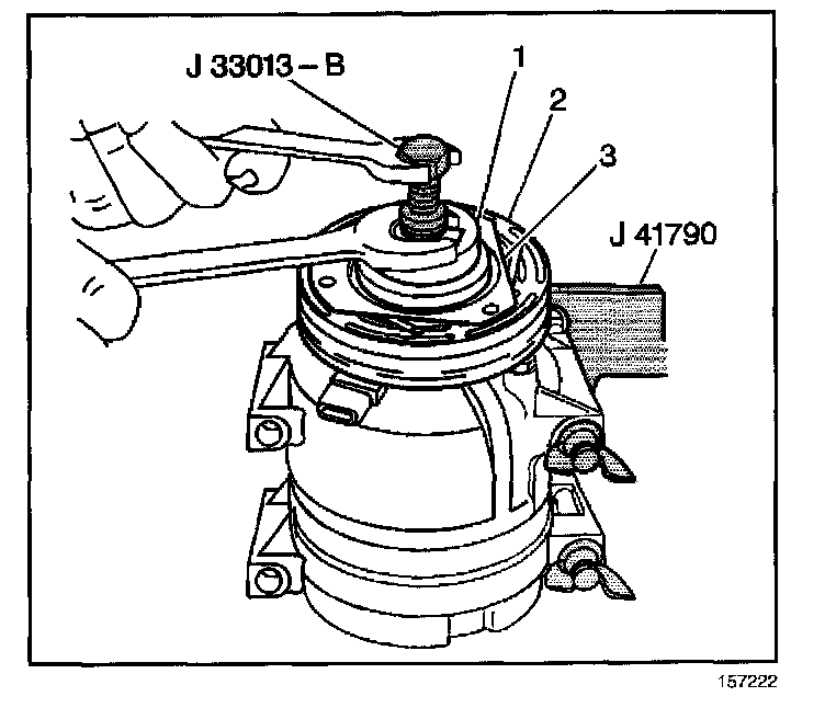 5. Install the J 33013-B and bearing tools (1) onto the clutch plate (3) and the hub assembly (2).