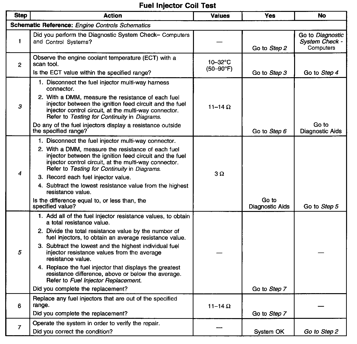 ^ Perform the fuel injector coil test within the conditions of the customers concern. A fuel injector condition may only be apparent at a certain temperature, or under certain conditions.