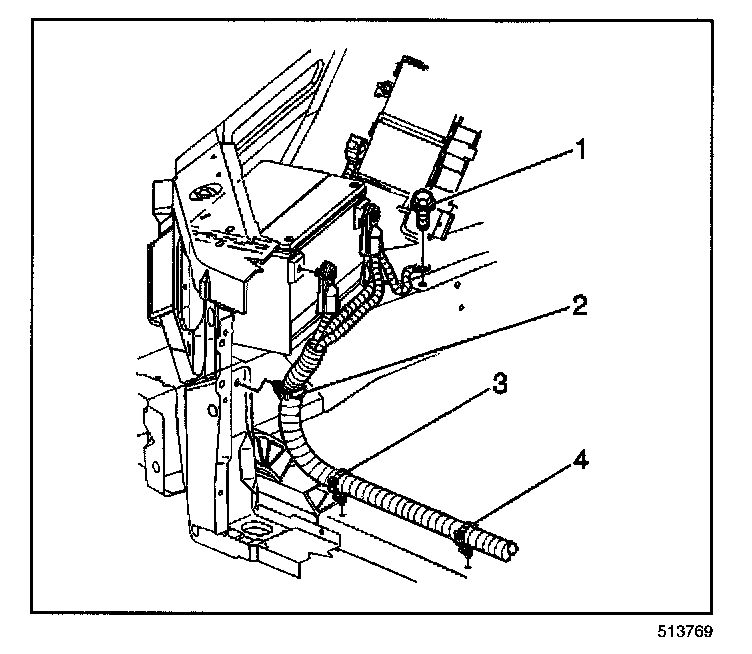 2. Install the battery cable harness to the harness retainers (2,3,4).