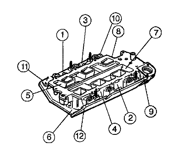 8. Install the lower intake manifold bolts (1-12). Apply thread lock compound GM P/N 12345382 or equivalent to the two hidden bolts and ensure they are installed.