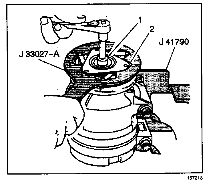 2. Hold the clutch hub and drive plate assembly (2) in place using the J 33027-A.