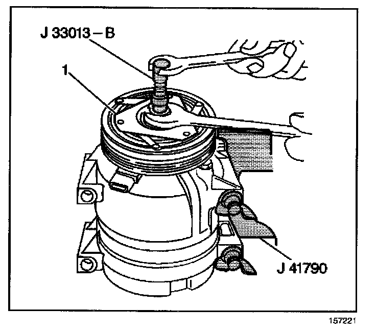5. Remove the hub and drive plate assembly (1) by turning the center screw into the body of the hub and drive plate installer and against the A/C compressor shaft.