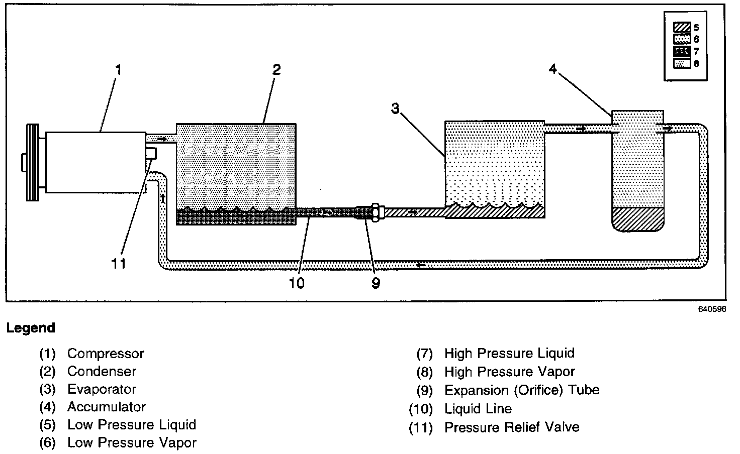 The Variable Displacement Orifice Tube (VDOT) refrigeration system is comprised of a variable displacement compressor and a fixed expansion (orifice) tube. This system can match the air conditioning demands under all conditions without cycling. When the A/C capacity demand is high, the suction pressure will be above the control point; a control valve will bleed discharge gas into the compressor crankcase and close off a passage from the compressor crankcase to the suction plenum. Depending on engine usage, the compressor is cut off. Following are some examples of conditions resulting in compressor cutoff: