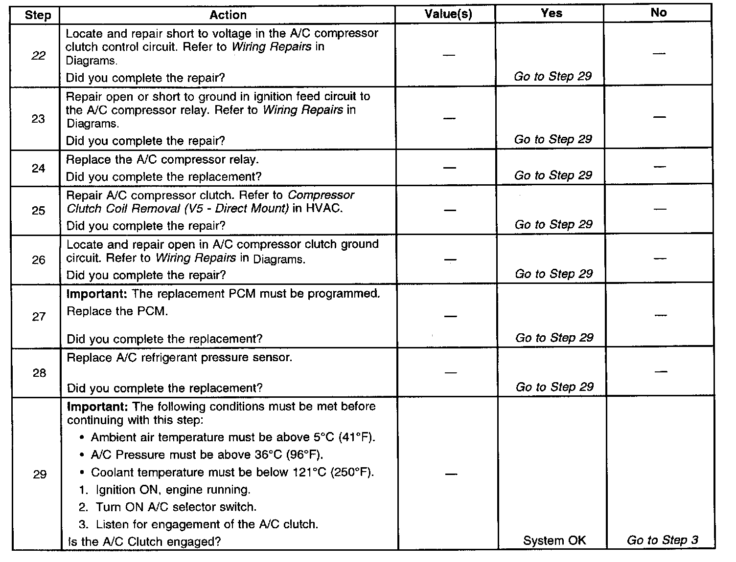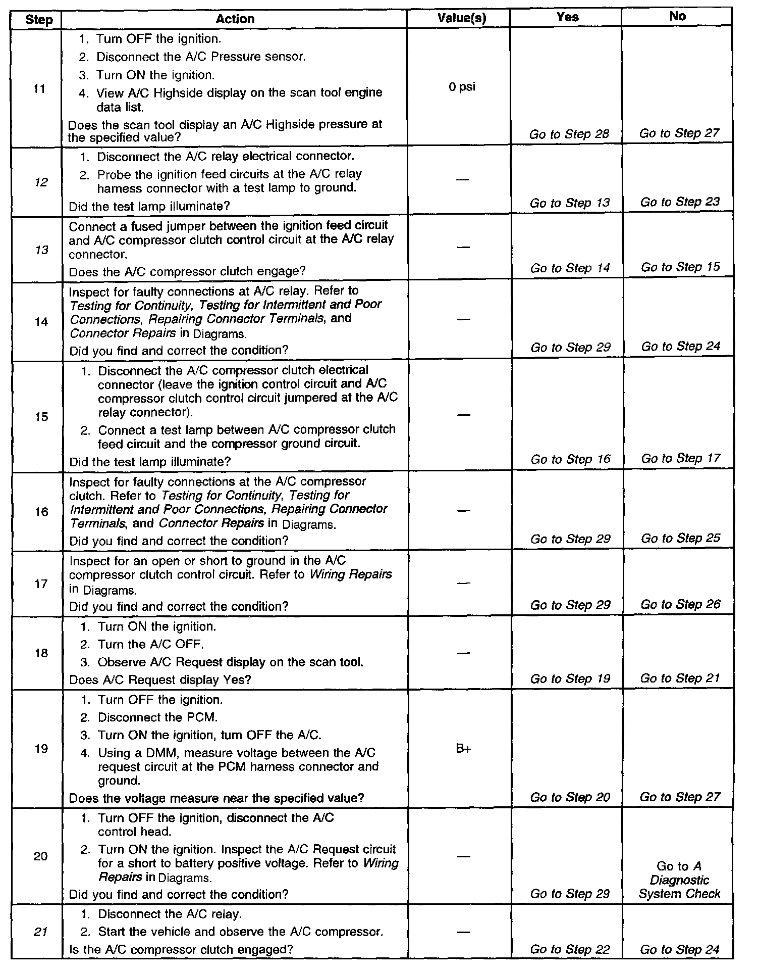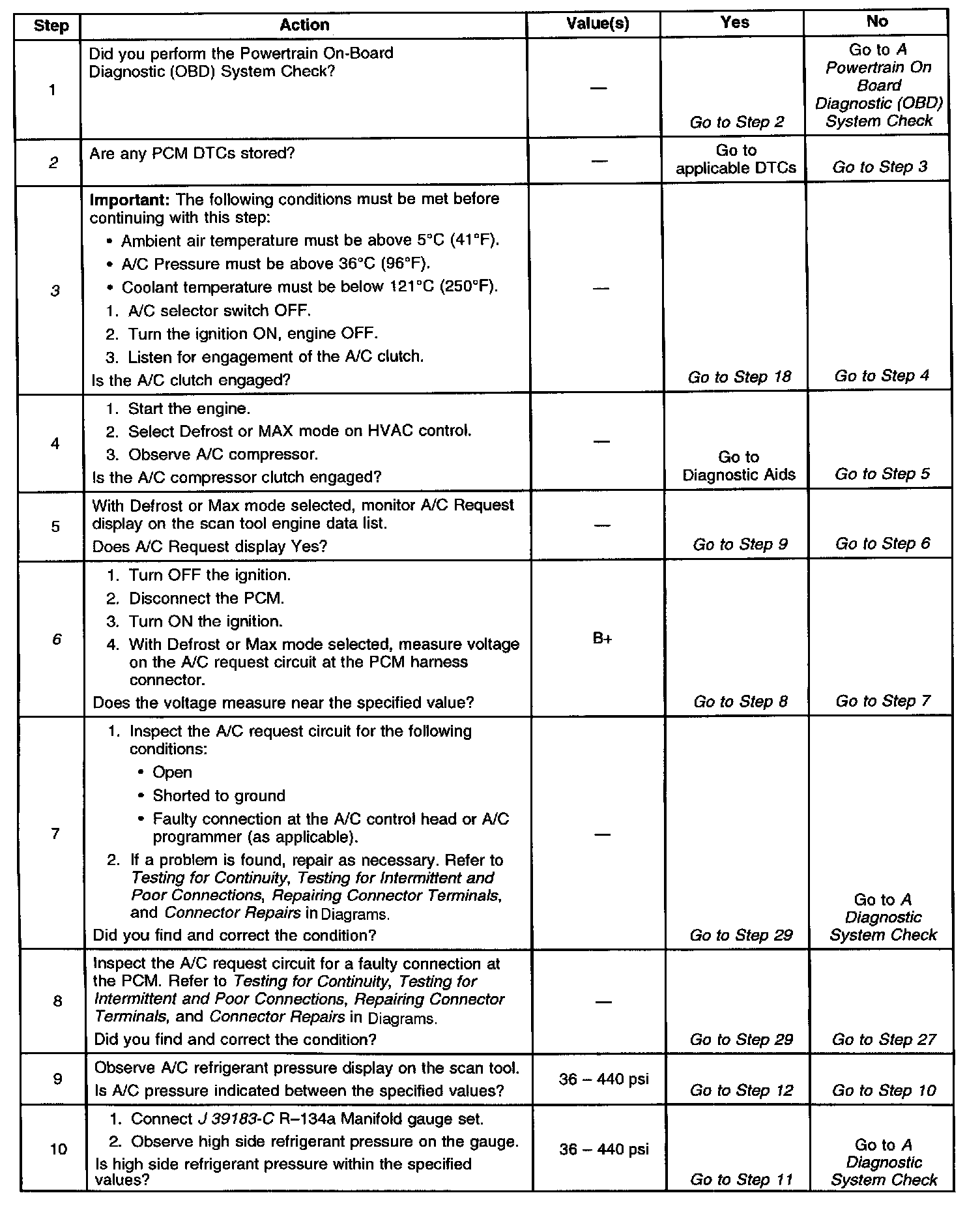 2. Stored Diagnostic Trouble Codes (That may not illuminate the Malfunction indicator Lamp) may disable the A/C compressor. This Diagnostic Table may lead to improper diagnosis and replacement of good parts if Diagnostic Trouble Codes are present.