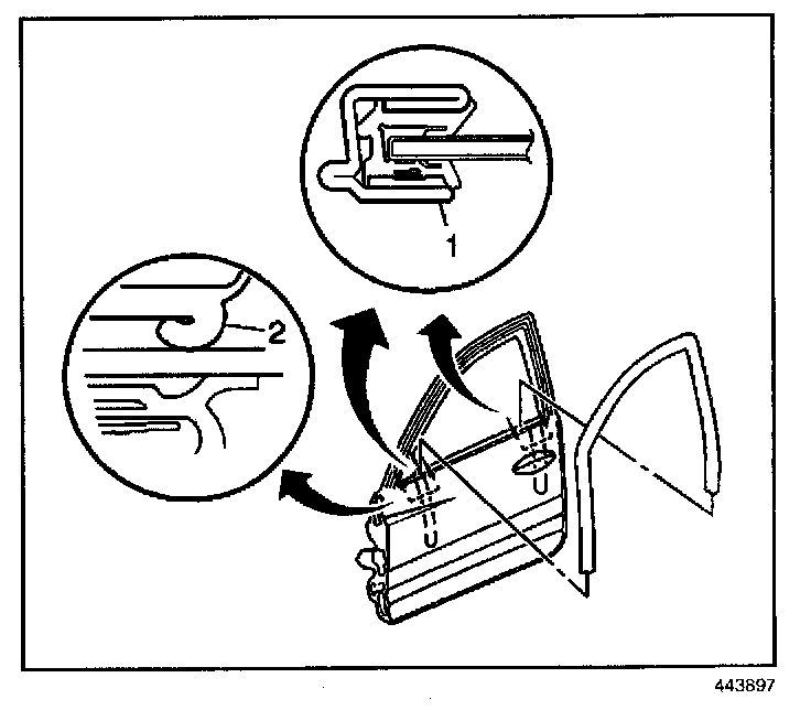 2.1. The glass run channel outboard lip at the rearview mirror is rolled over or the glass run channel outboard lip at the center pillar is rolled over (2).