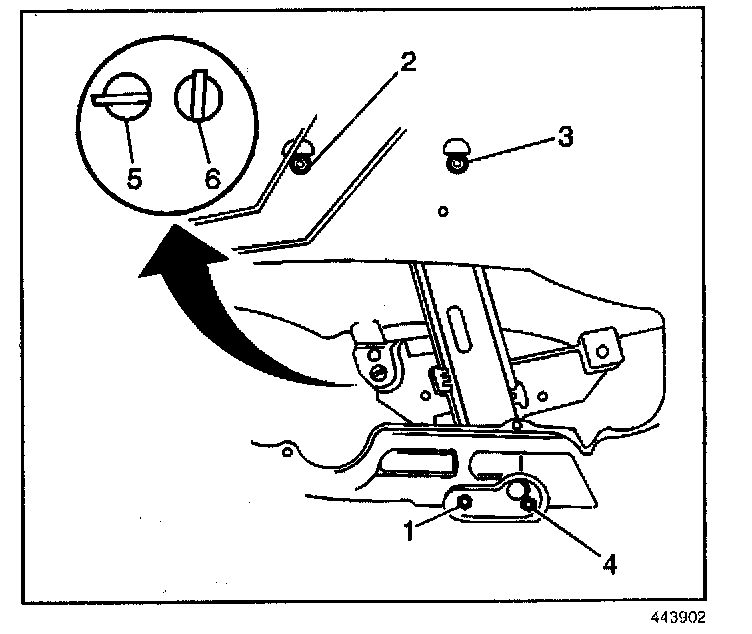 Rotate the cam (5) on the window regulator plate so that the slot (6) is straight up and down. In this position, the back of the glass will tilt forward.