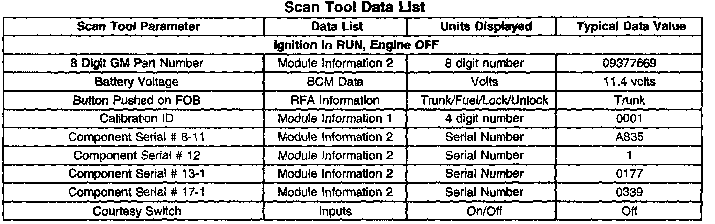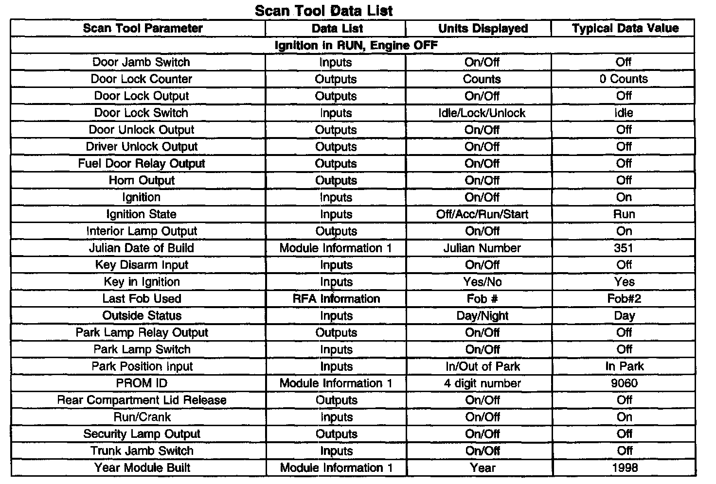 The Keyless Entry Scan Tool Data List contains all of the keyless entry related parameters that are available on the scan tool. The parameters in the list are arranged in alphabetical order. The column, Data List, indicates the location of the parameter within the scan tool menu selections. Use the Keyless Entry Scan Tool Data List as directed by a diagnostic table or in order to supplement the diagnostic procedures. Begin all of the diagnostic procedures with Diagnostic System Check - Remote keyless Entry. Use the Scan Tool Data List only after the following is determined: