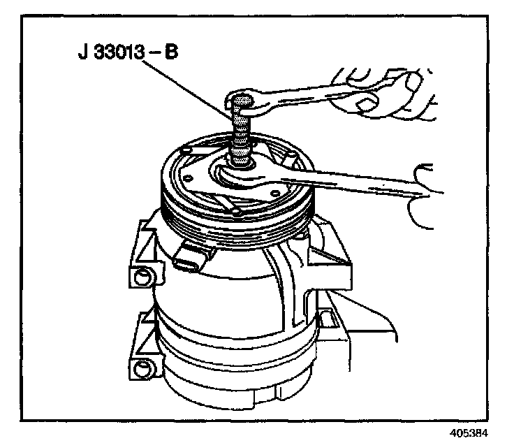 6. Back the body of the J 33013-B remover-installer off then thread the center screw several turns into the end of the compressor shaft.