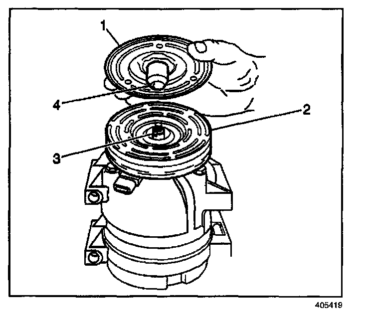 3. Align the shaft key in the clutch plate (4) with the keyway in the compressor shaft (3) and install the clutch plate.