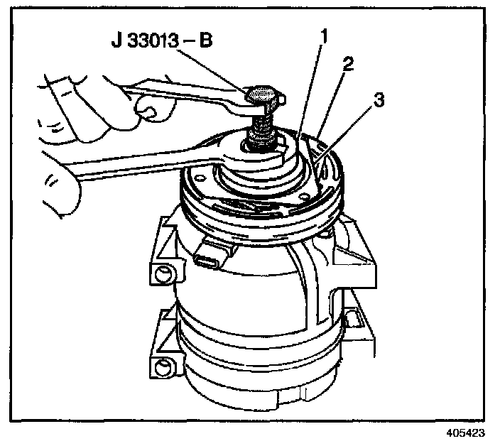 5. Install the J 33013-B remover-installer with bearing (1) into the clutch plate (3) and hub assembly (2).