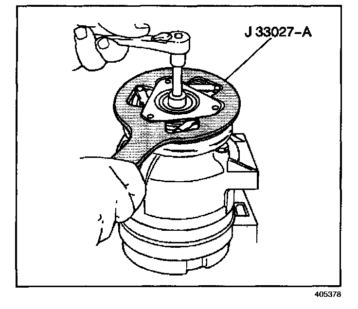 13. Install the J 33027-A to hold the compressor clutch hub.