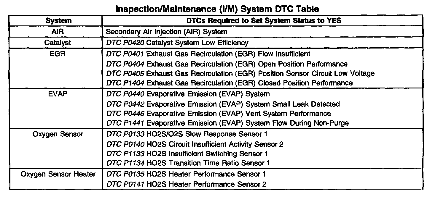 Inspection/Maintenance (I/M) System DTC Table: