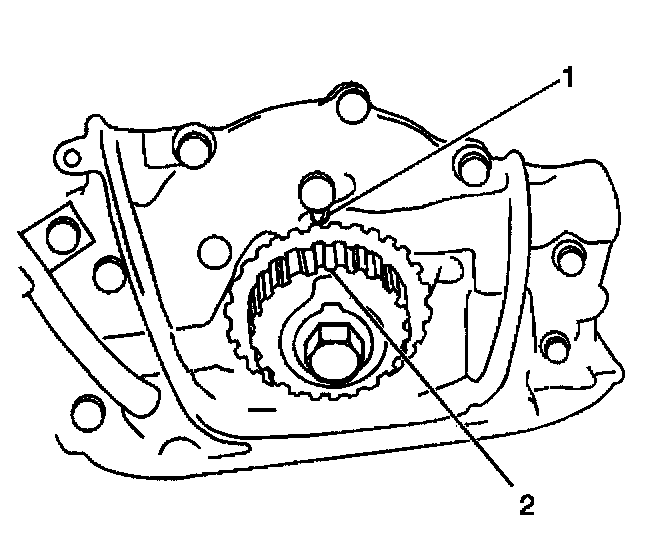 Ensure that the punch mark on the crankshaft timing belt pulley (2) is aligned with the arrow mark on the oil pump case (1).