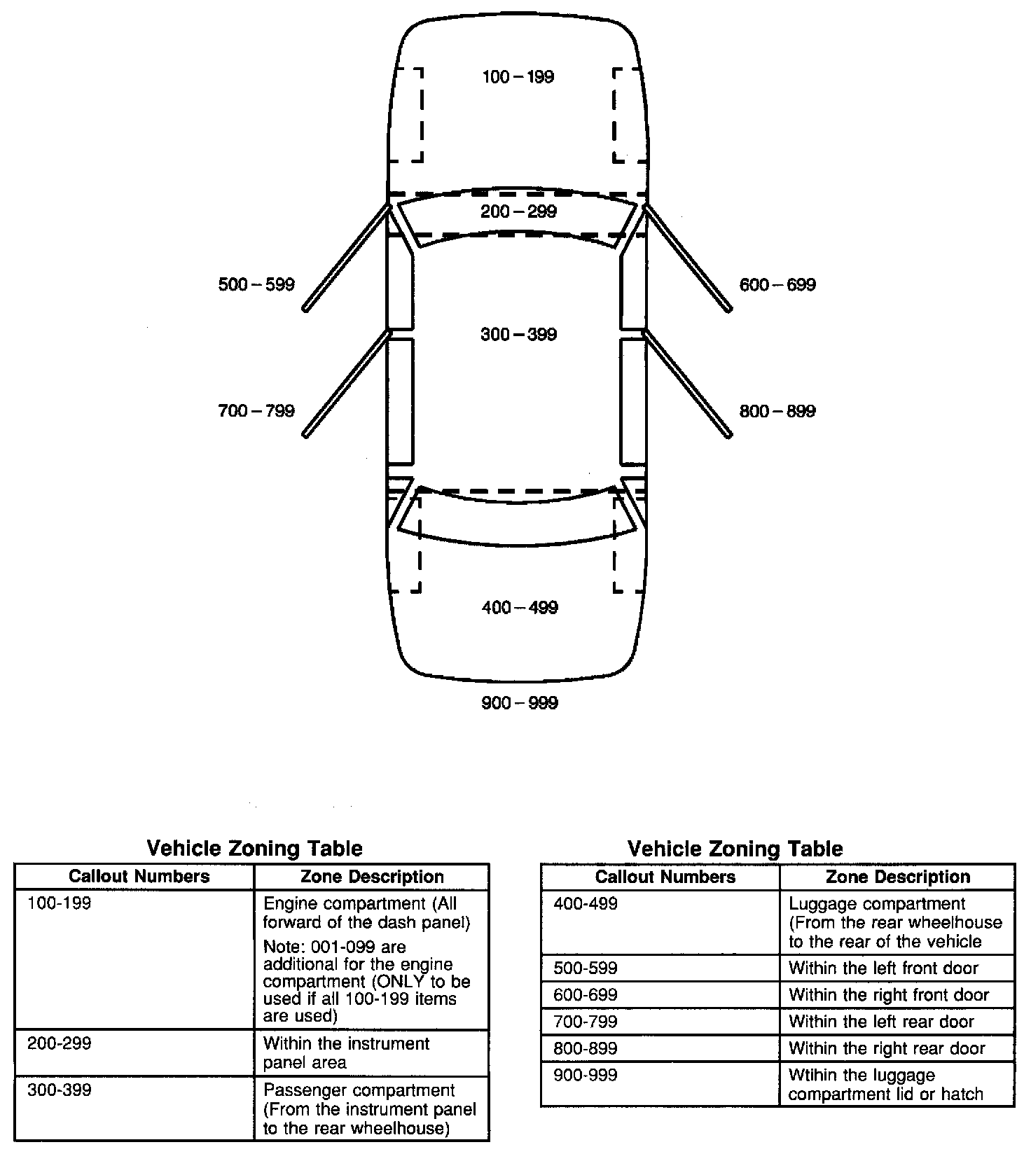 All grounds, in-line connectors, pass-through grommets, and splices have identifying numbers that correspond to where they are located in the vehicle. The following table explains the numbering system.