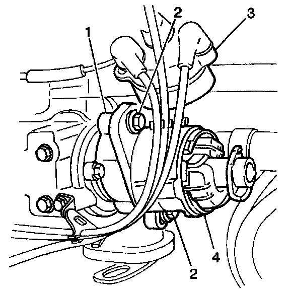 5. Remove two distributor flange bolts (2) and the distributor housing (4) from the cylinder head.