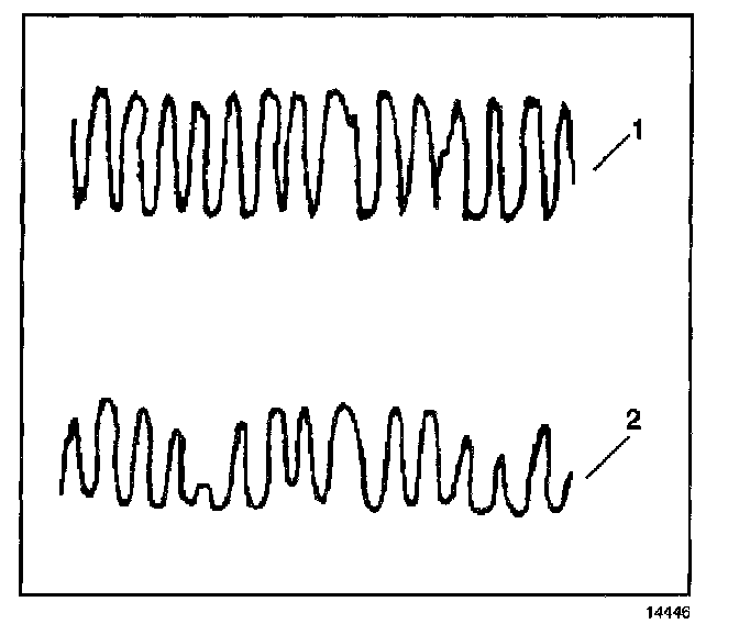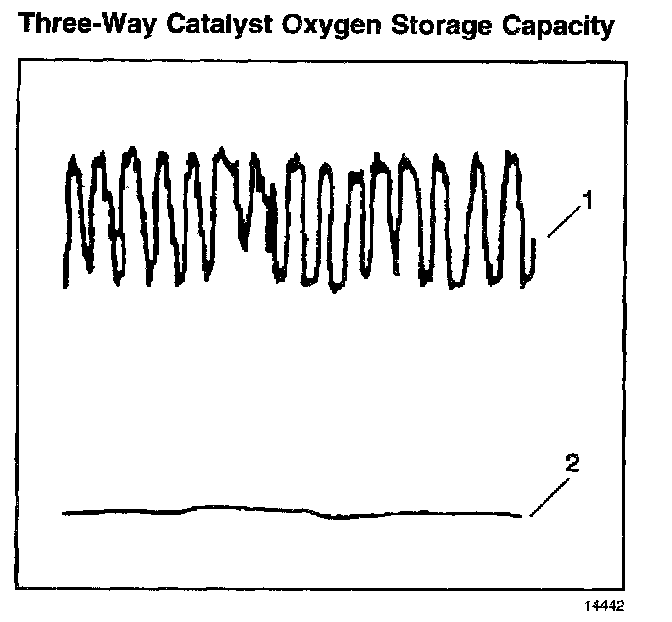 The control module must monitor the Three-Way Catalyst (TWC) system for efficiency. In order to accomplish this, the control module monitors the pre-catalyst and post-catalyst oxygen sensors. When the TWC is operating properly the post-catalyst (2) oxygen sensor will have significantly less activity than the pre-catalyst (1) oxygen sensor. The TWC stores the oxygen as needed during the normal reduction and oxidation process. The TWC releases oxygen as needed during the normal reduction and oxidation process. The control module calculates the oxygen storage capacity using the difference between the pre-catalyst and post-catalyst oxygen sensor voltage levels.