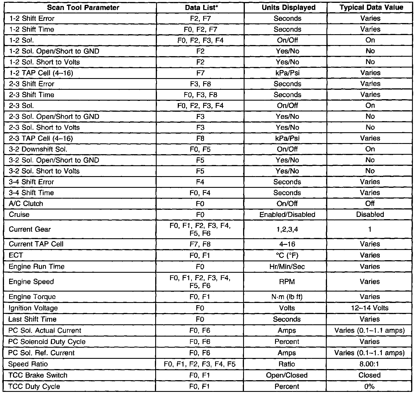 Only the parameters listed below are used for diagnosing. If a scan tool displays other parameters, the values are not recommended by General Motors for use in diagnosis. Scan tool values below were recorded under the following conditions: