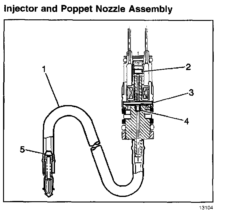 Each fuel injector assembly is a solenoid-operated device, controlled by the control module. The fuel injector assembly meters the pressurized fuel through a poppet nozzle valve (5) to a single engine cylinder. The control module energizes the flow control solenoid (2), which opens an armature valve (3), allowing fuel to flow past the valve and through a flexible fuel pipe (1) to the poppet nozzle valve. An increase in fuel pressure causes the poppet nozzle ball to open from a seat against the extension spring force. This allows the fuel to flow from the nozzle.