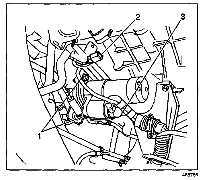 10. Remove the starter upper mounting bolt (1) and remove the ground wire.