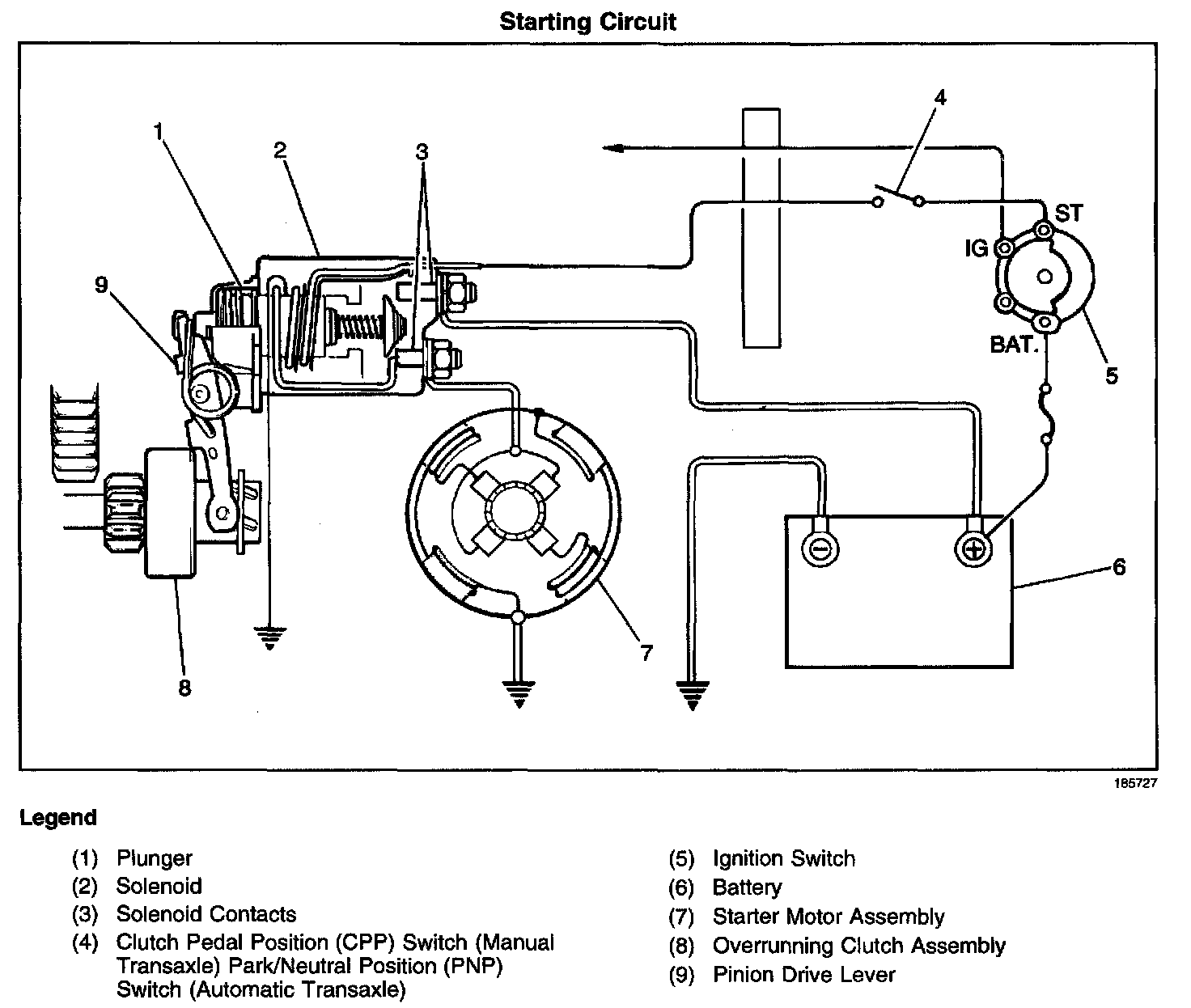 Moving the ignition switch to the CRANK position closes the circuit to both the pull-in and hold-in windings. The transmission range switch or the Clutch Pedal Position (CPP) switch are in series with, and must be closed, in order for voltage reach the starter solenoid S terminal. Moving the ignition switch to the CRANK position also sends a 12 V signal to the PCM.