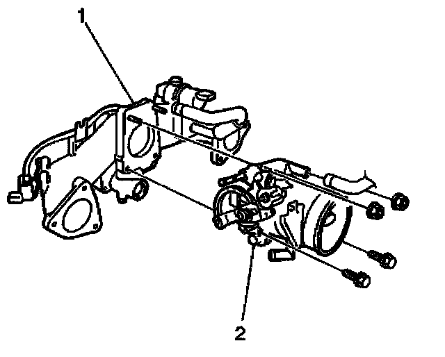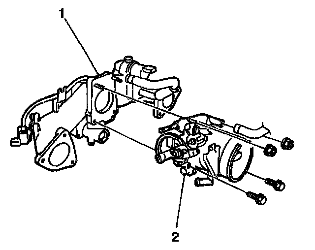 4. Install the throttle body (2) to the intake collector (1). Secure the throttle body with the 2 bolts and 2 nuts.