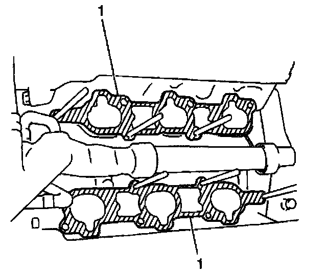 1. Install the new intake manifold gaskets (1) onto the cylinder heads.