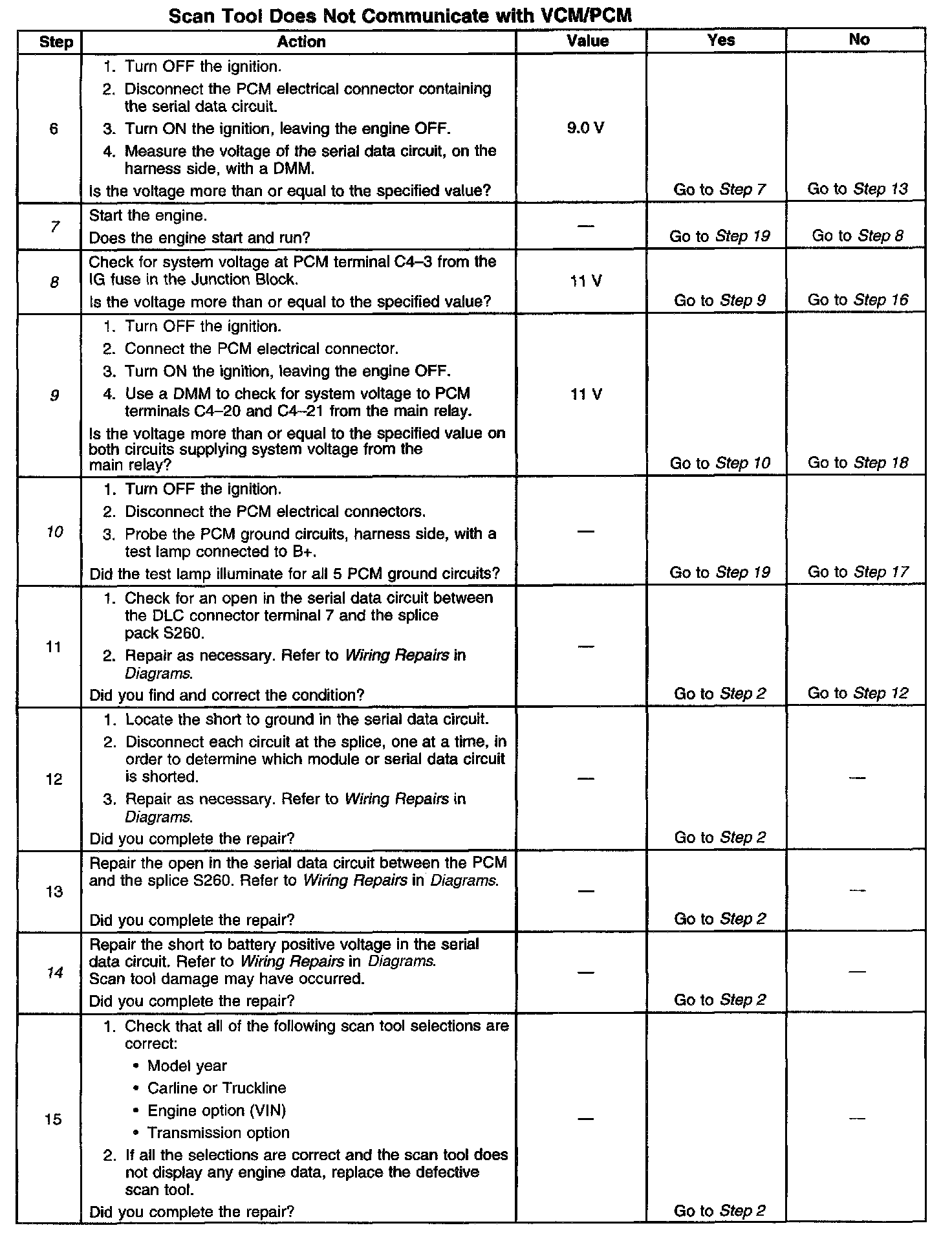 9. This step checks whether the PCM is receiving ignition positive voltage from the main relay when the ignition is ON. The PCM can not provide serial data without ignition positive voltage from the main relay.