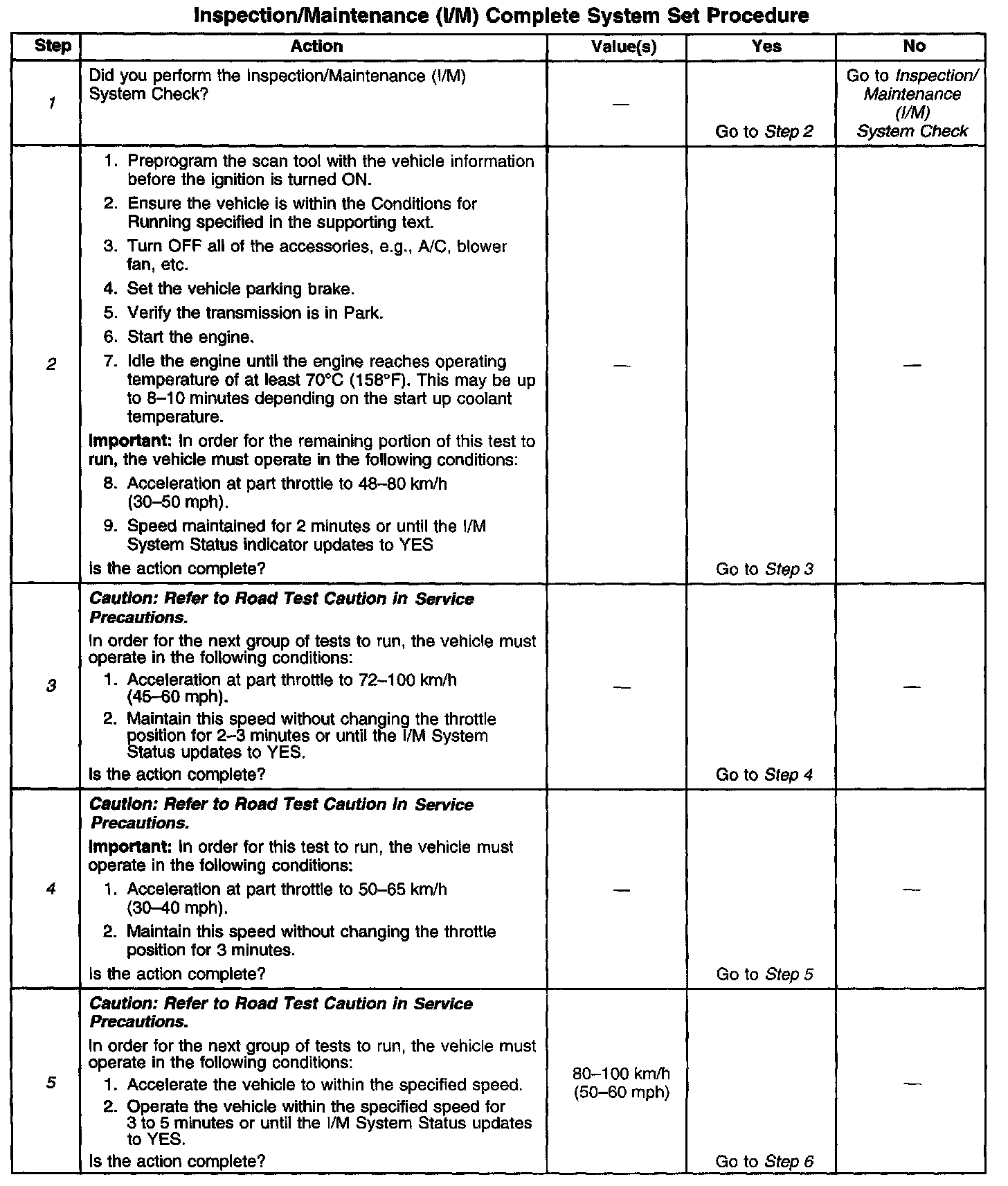 DESCRIPTIONThe purpose of the I/M Complete System Set Procedure is to satisfy the enable criteria necessary to execute all of the I/M readiness diagnostics, and complete the trips for those particular diagnostics. When all diagnostic tests are completed, the I/M System Status indicators are set to YES. Perform this test when more than one or all of the I/M System Status indicators are set to NO.