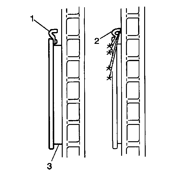 ^ Inspect both edges of the disc brake pad friction surfaces (3). The highest rate of wear normally occurs at the trailing edge of the disc brake pads.