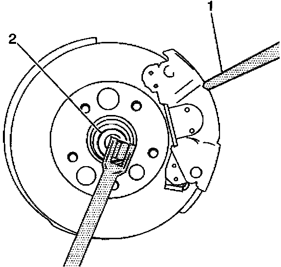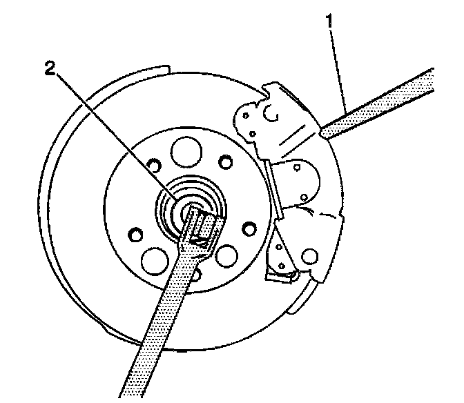 7. Insert a drift or punch (1) through the brake caliper and into the brake rotor in order to prevent the hub and bearing from turning.