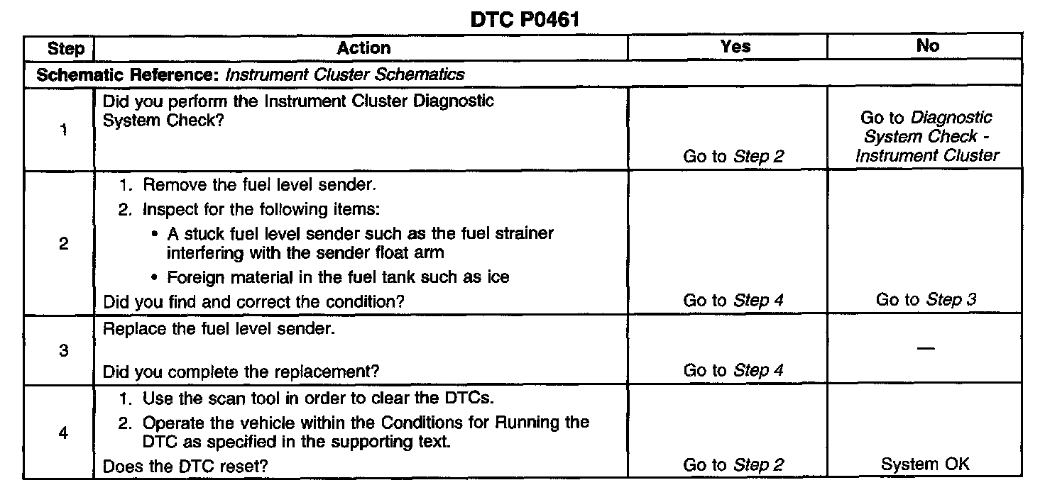 CIRCUIT DESCRIPTIONThe fuel level sender changes resistance based on fuel level. The PCM monitors the signal circuit of the fuel level sender in order to determine fuel level. When the fuel tank is full, the sender resistance is high and the PCM senses a high signal voltage. When the fuel tank is empty, the sender resistance is low and the PCM senses a low signal voltage. The PCM uses the signal circuit of the fuel level sender in order to calculate the total remaining fuel percent in the tank. The PCM sends the fuel level percent via the class 2 serial data circuit to the instrument cluster in order to control the fuel gage. The fuel level information is also used for misfire and EVAP diagnostics.