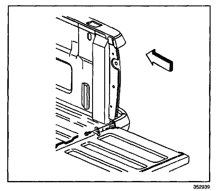 1. With an assistant, install the endgate onto the left body side hinge by sliding to the left and lifting.