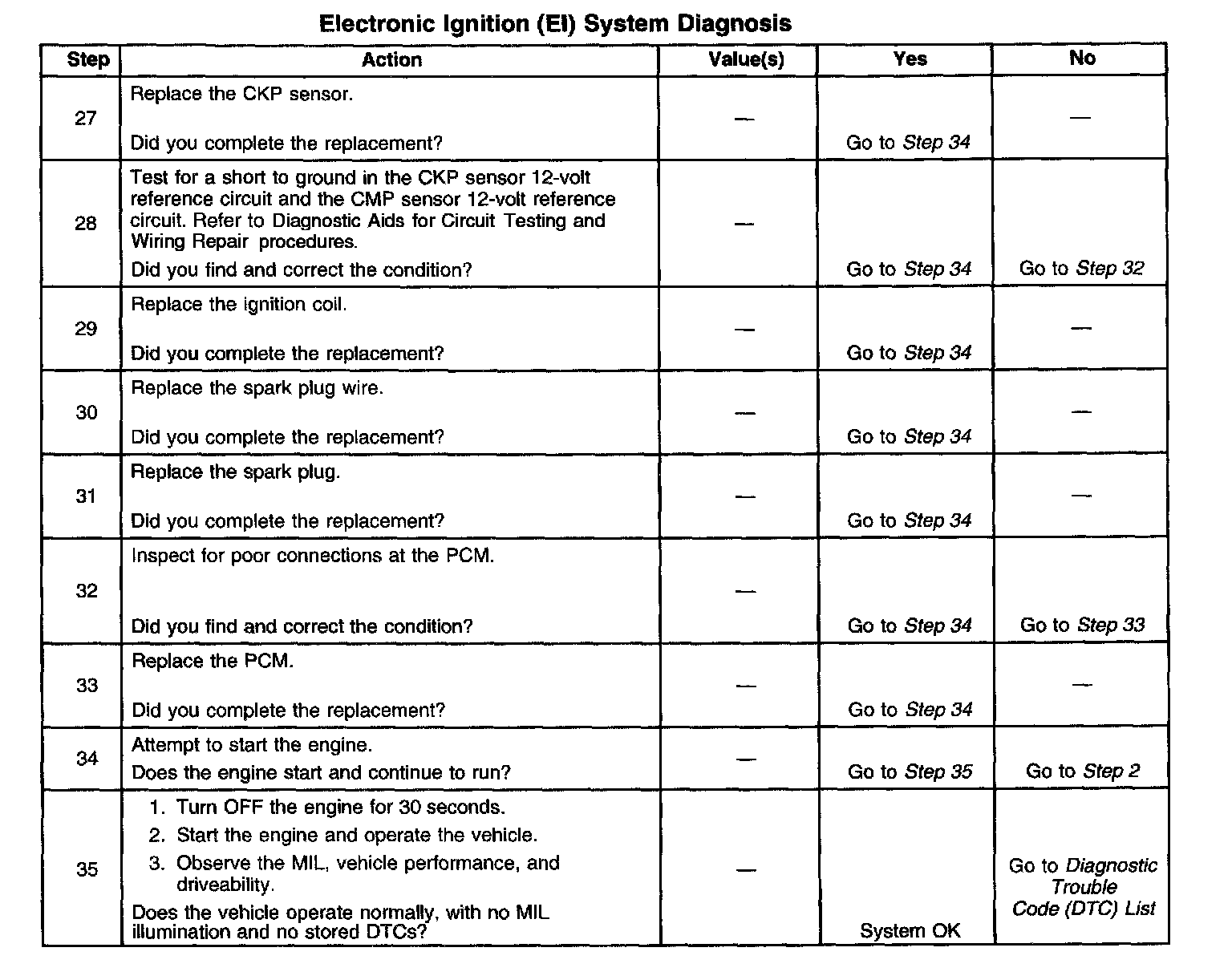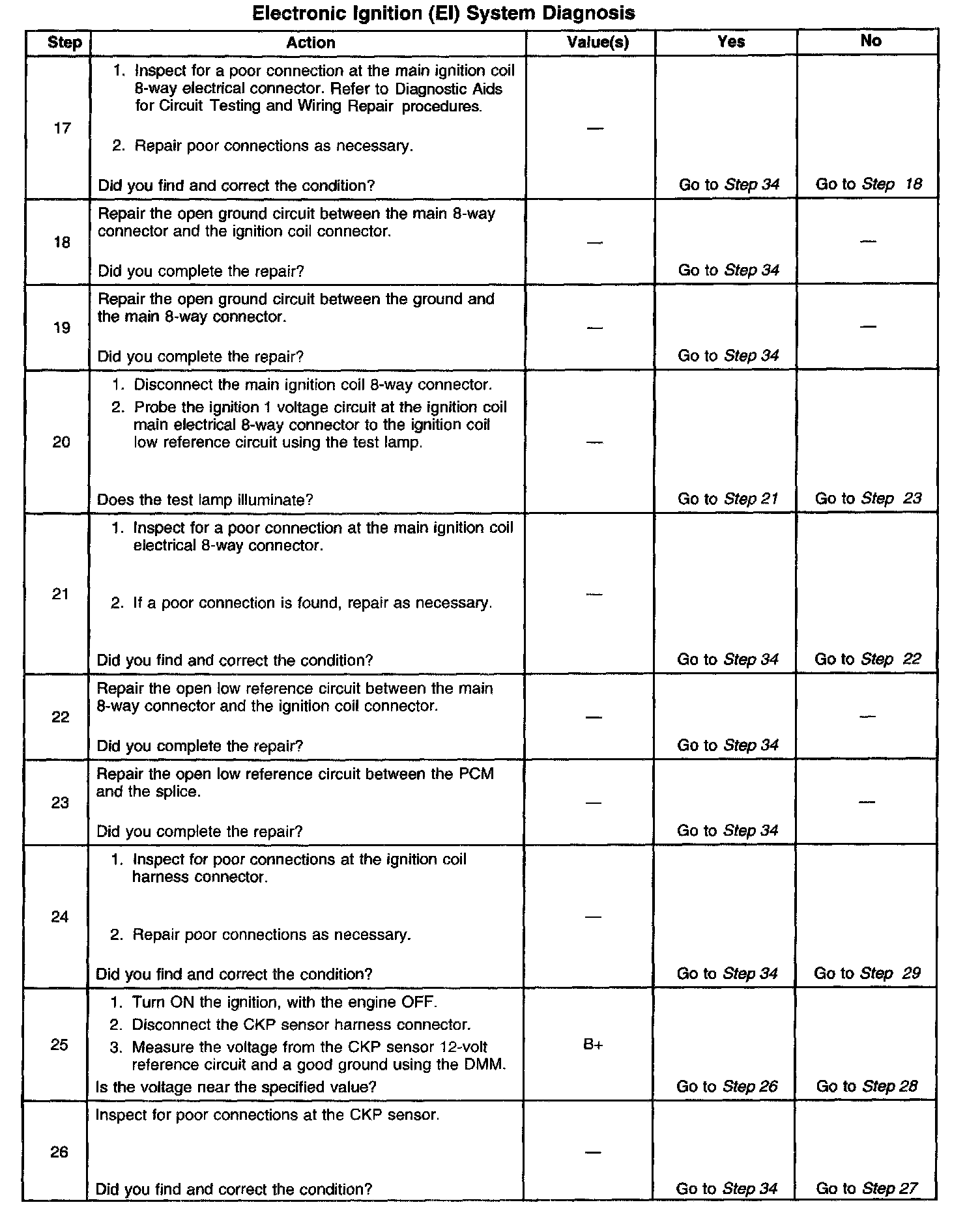 The numbers below refer to the step numbers on the diagnostic table.