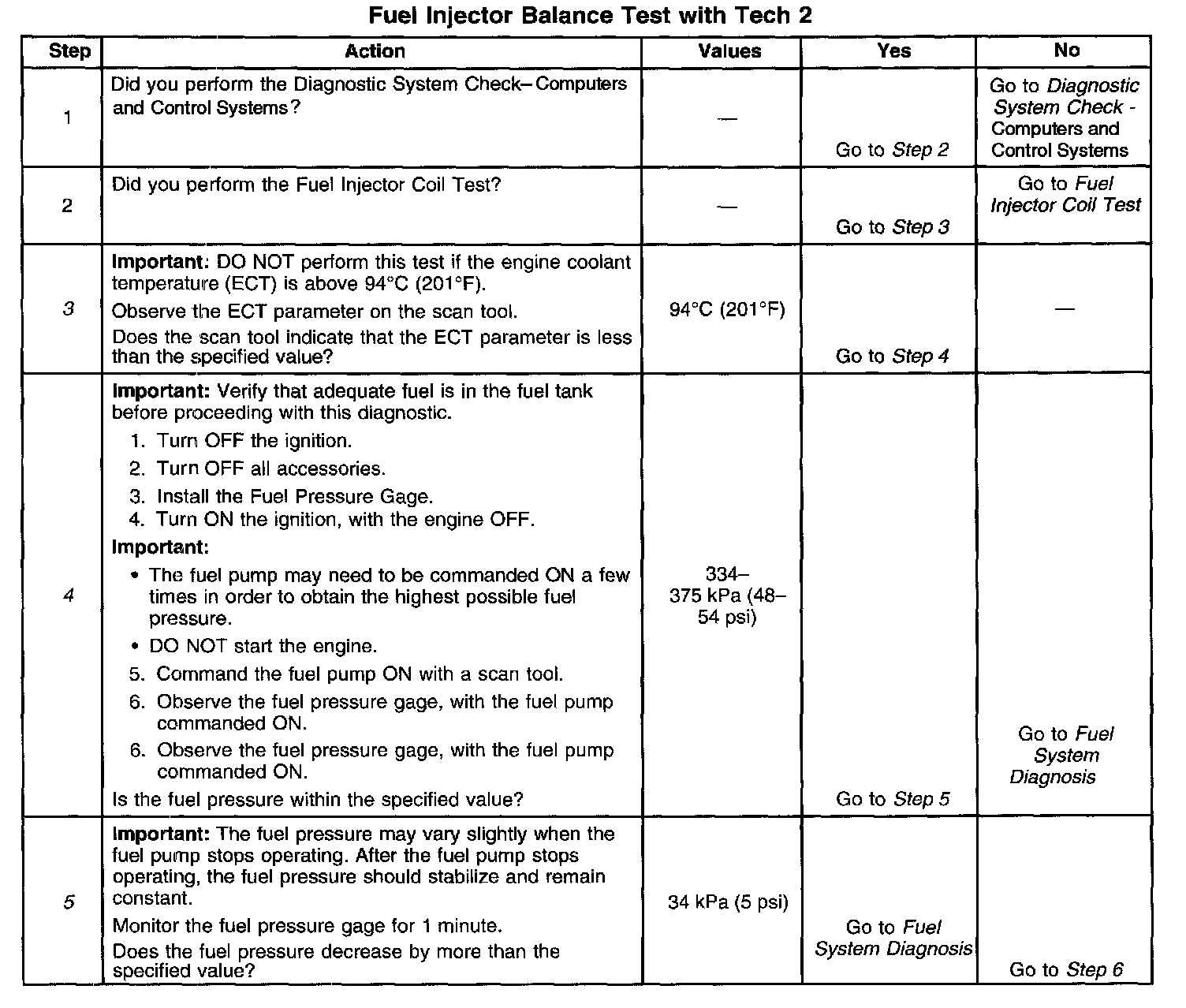 5. The fuel pressure should reach a steady value. Refer to Fuel System Diagnosis if the fuel pressure does not stabilize. Component Tests and General Diagnostics