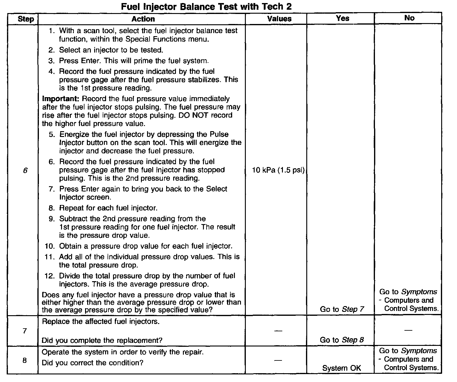 6. If the pressure drop value for each fuel injector is within 10 kPa (1.5 psi) of the average pressure drop value, the fuel injectors are flowing properly. Calculate the pressure drop value for each fuel injector by subtracting the second pressure reading from the first pressure reading.