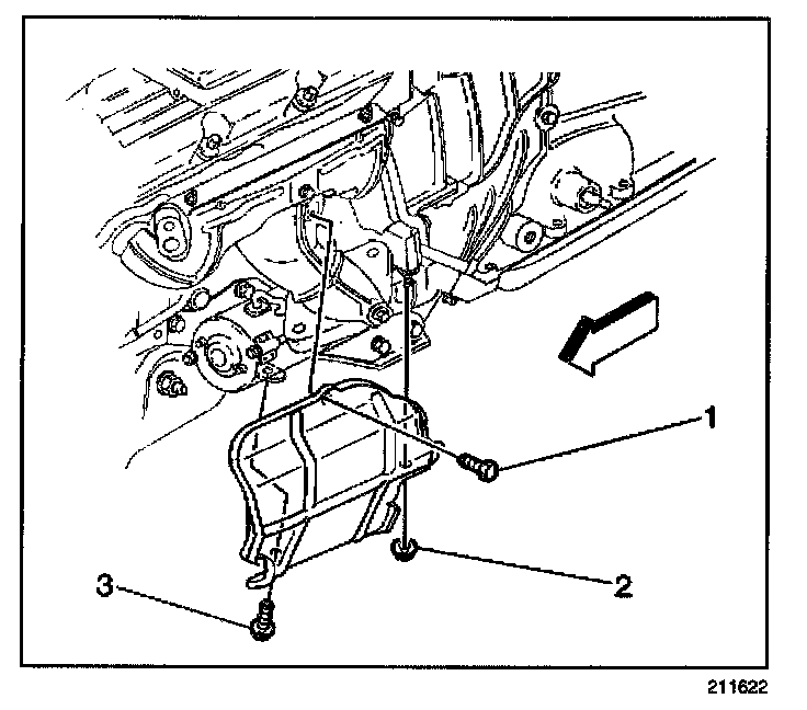 2. Remove the starter motor shield bolts (1, 3) and nut (2).