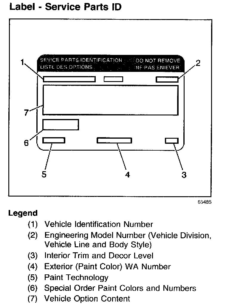 The Service Parts Identification Label aids the service personnel in identifying the parts and options originally installed on the vehicle. The label is located on the driver door.